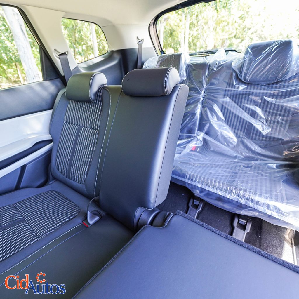 3 filas de asientos tapizados en tela.